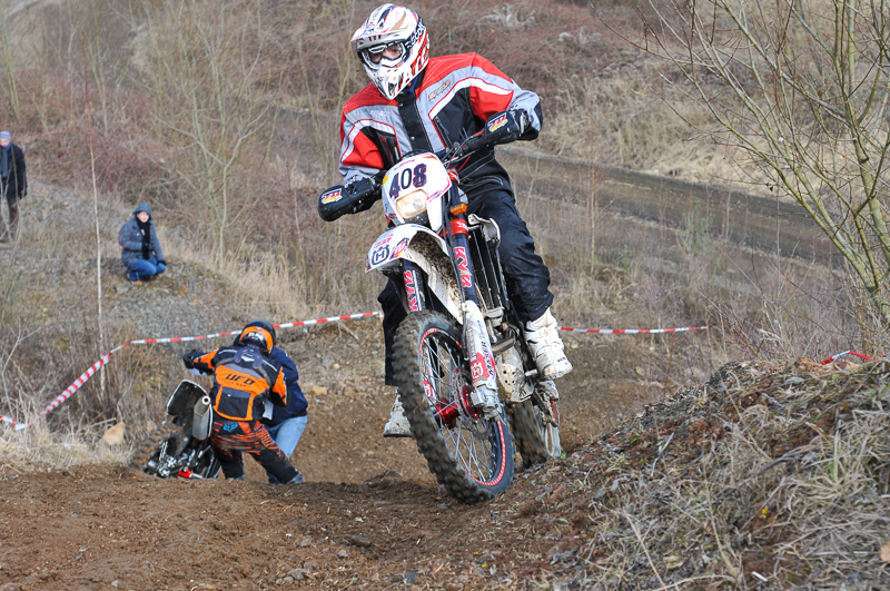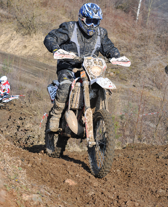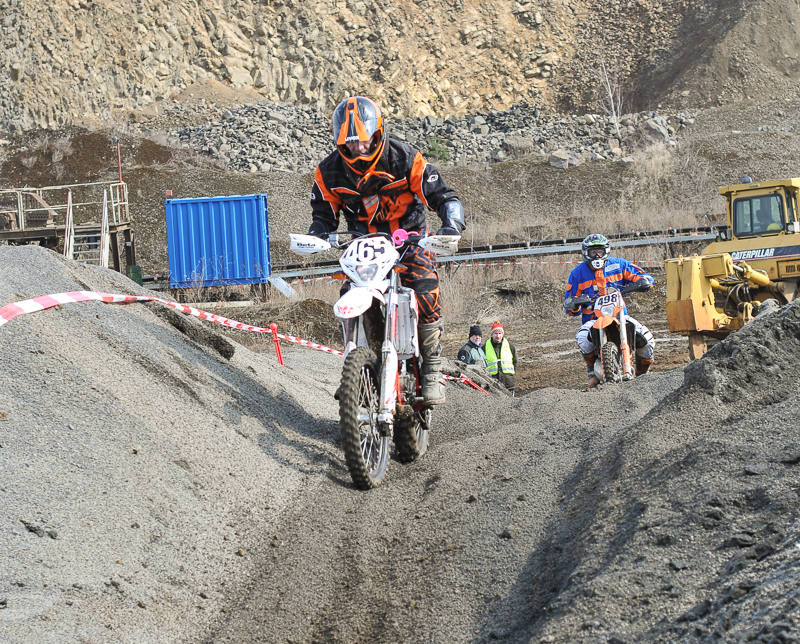 Die Planung der Wertungsprüfung geschah allerdings noch im Schnee, was es nicht einfacher machte. Auch wenn einige Passagen wegen der Witterung nicht genutzt werden konnten, gelang es eine anspruchsvolle Wertungsprüfung in dem Steinbruch zusammenzustellen. Besonders an einer schweren Steilauffahrt zu Beginn der Strecke bissen sich einige Fahrer immer wieder fest. Darunter leider auch Clubfahrer Kai Balster, der sich sogar die nagelneue Beta RR400 an dieser Stelle beschädigte.