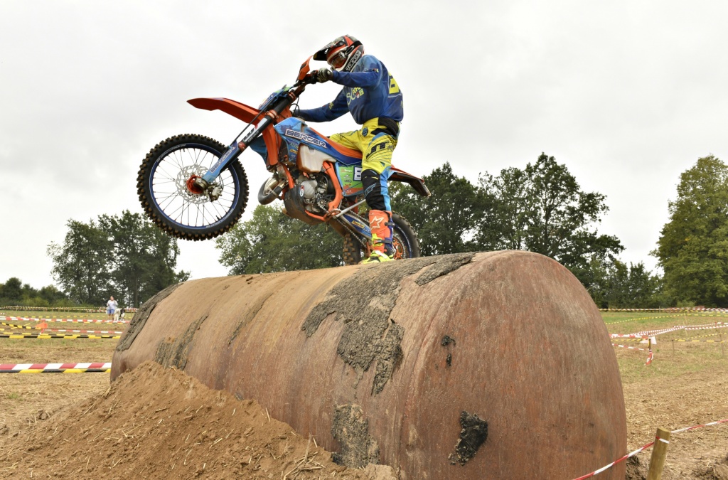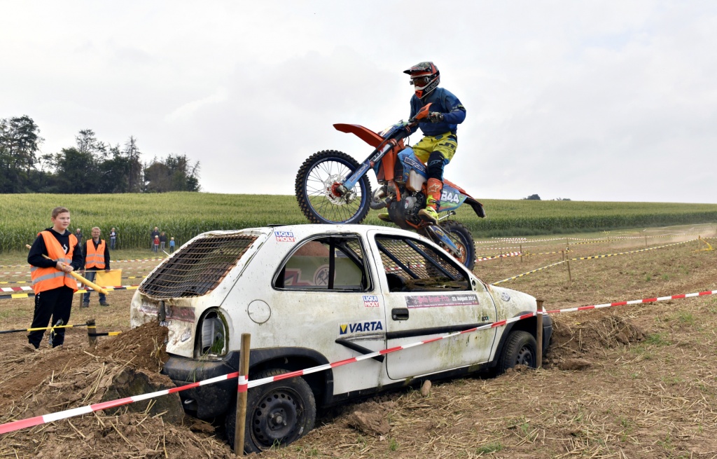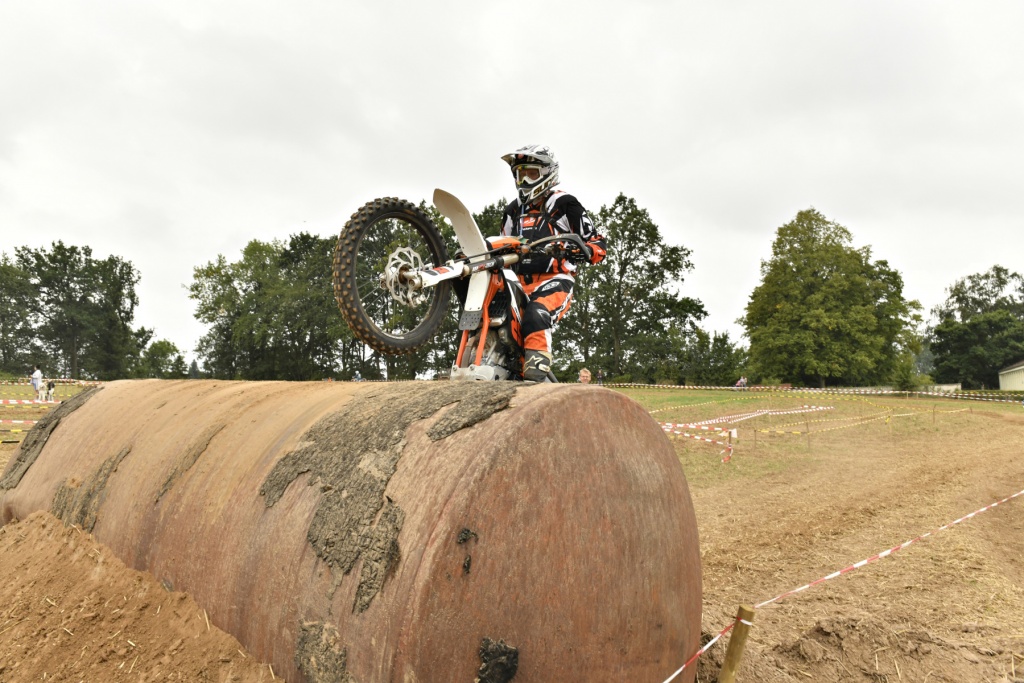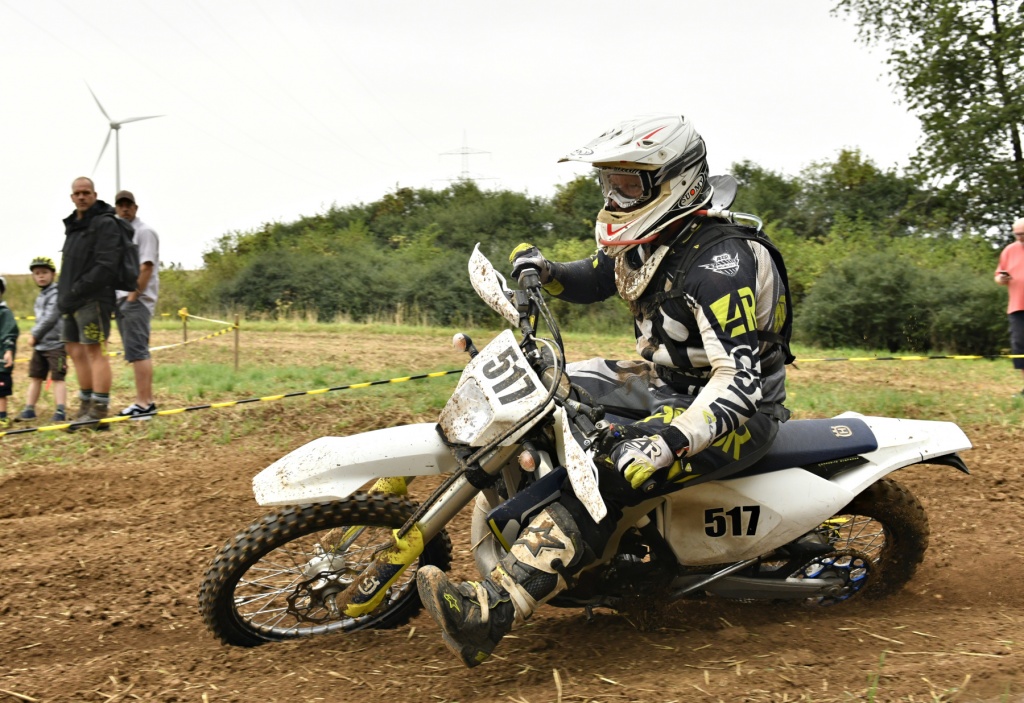 Vor dem Start der Enduro-Motorräder hatte der nächtliche Regen die Strecke schon einmal staubfrei hinterlassen. Für die PS-starken Motorräder hatte der MSC Lippe-West nicht nur zusätzliche Streckenteile unter den Windrädern dazu genommen, sondern auch noch anspruchsvolle Hindernisse in den Parcours eingebaut. Vom Auto, dass überfahren werden musste, bis zu kleinen Holzstapeln, die im Weg standen, gab es für die Enduro-Fahrer verschiedene Schwierigkeiten zu überwinden. Das wurde noch schwerer, als in den beiden Läufen jeweils auch noch leichter Regen einsetzte und das Metall und die Baumstämme besonders rutschig machte. Aber zum Glück gab es auch an jedem Hindernis die Möglichkeit über eine längere Umfahrung das Risiko eines Sturzes zu umgehen.