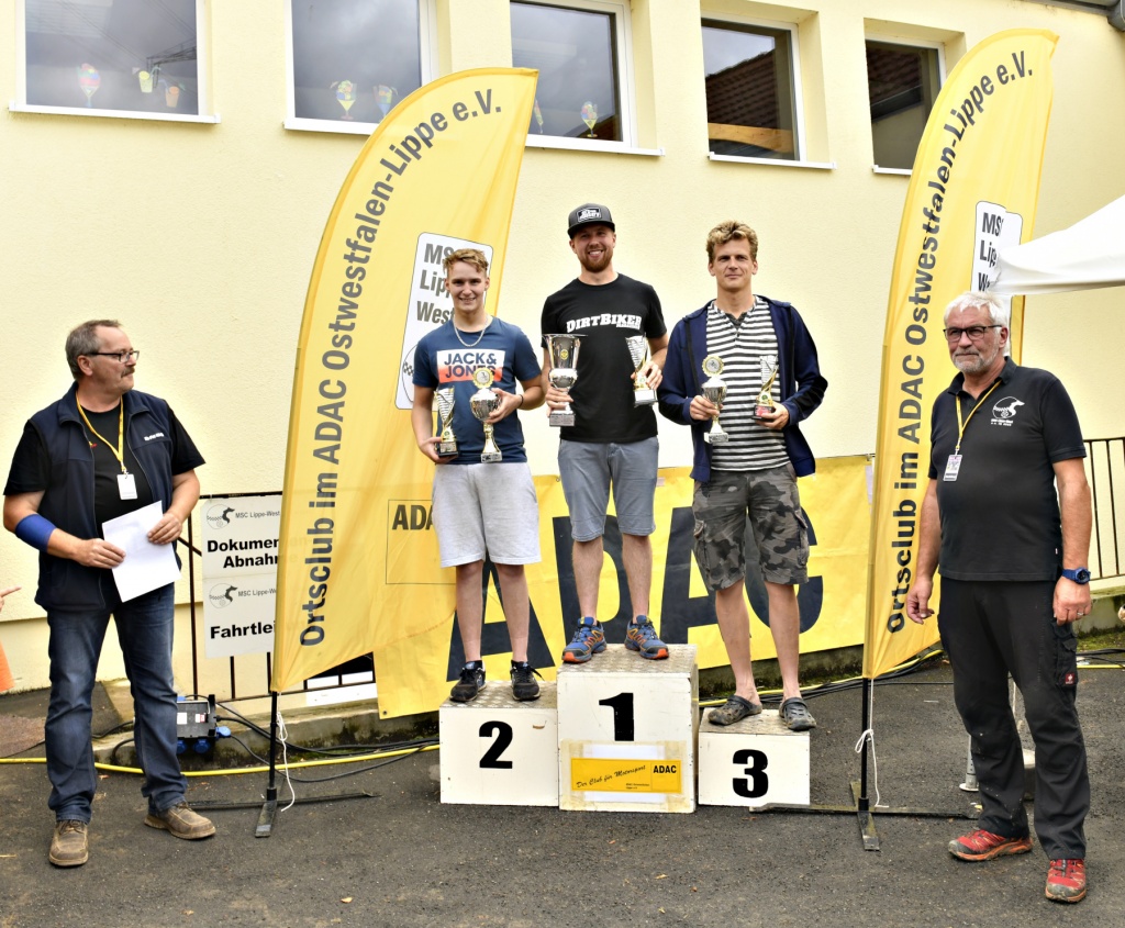 Noch erfolgreicher schnitten die Junioren des MSC Lippe-West in ihrer Klasse ab: Johannes Grommel aus Oerlinghausen wurde Zweiter in der Klasse und Tobias Kassen aus Leopoldshöhe belegte den dritten Platz. MSC-Senior Bruno Kuhn aus Bielefeld verpasste mit einem fünften Platz in der Klasse der Fahrer über 50 Jahre diesmal den Sprung auf das Treppchen und den dazugehörigen Pokal.