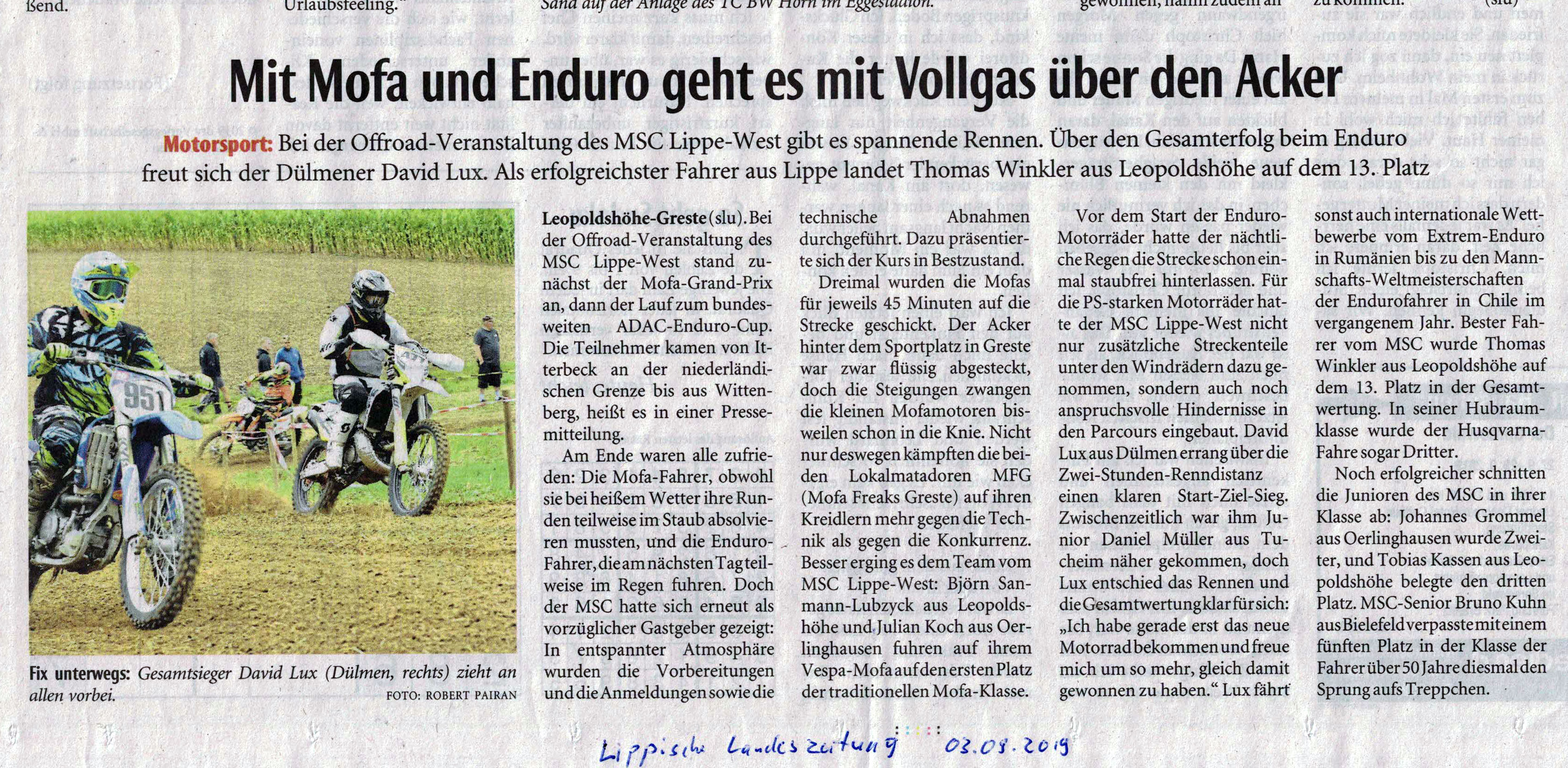 Bester Fahrer vom MSC Lippe-West wurde Thomas Winkler aus Leopoldshöe auf einem 13 Platz in der Gesamtwertung. In seiner Klasse wurde der Husqvarna-Fahrer sogar Dritter.